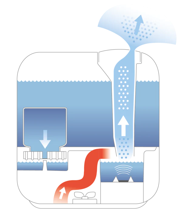 - Ultraskaņas tehnoloģija pārvērš ūdeni smalkā miglā, kas ātri iztvaiko